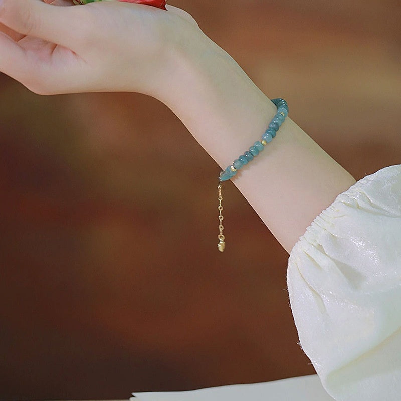 This bracelet's beads are composed of **natural blue water jadeite**, which is prized for its clear, water-smooth texture and revitalizing hue. The distinctive ice-transparent look of blue water jadeite is peaceful and soothing. Jadeite is seen as a lucky charm, a sign of prosperity, and a sign of good health in Eastern culture. Blue water jadeite's serene and grounded tone promotes inner serenity and relaxation, balances the wearer's energy field, improves their aura, and draws good fortune.