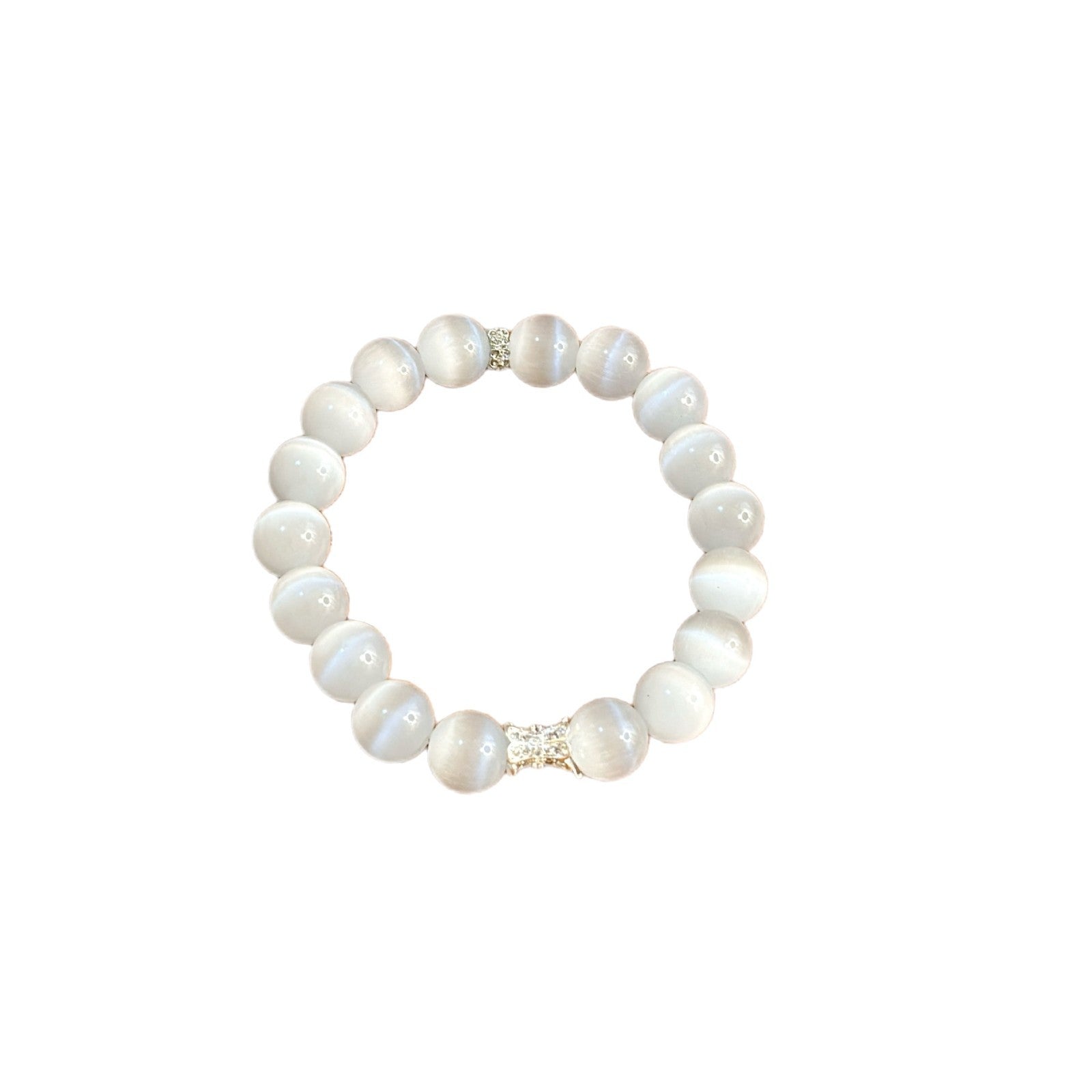 The utilization of **Ice-Grade Cat's Eye Stone** as the primary component of this bracelet is its focal point. Cat's eye stones, particularly the ice-grade kind, are known for their distinctive optical effect. They have a more transparent texture and a surface that gives off an enigmatic sheen that resembles a cat's eye. A smooth and captivating atmosphere is added to the wearer by the cat's eye effect, which causes the beads to glitter with shifting light, giving the impression that there are countless secrets. The 10mm beads are the ideal size to completely display the allure of the cat's eye stone without being overly big.